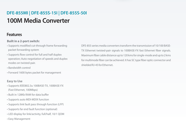 The D-Link DFE-855Mi is a reliable and compact media converter that bridges 10/100BASE-TX Ethernet over twisted-pair copper cables to 100BASE-FX optical fiber for seamless network integration. DFE-855Mi Designed for multi-mode fiber, it supports transmission distances of up to 2 kilometers, making it an excellent choice for extending network connections in enterprise, campus, and industrial environments.