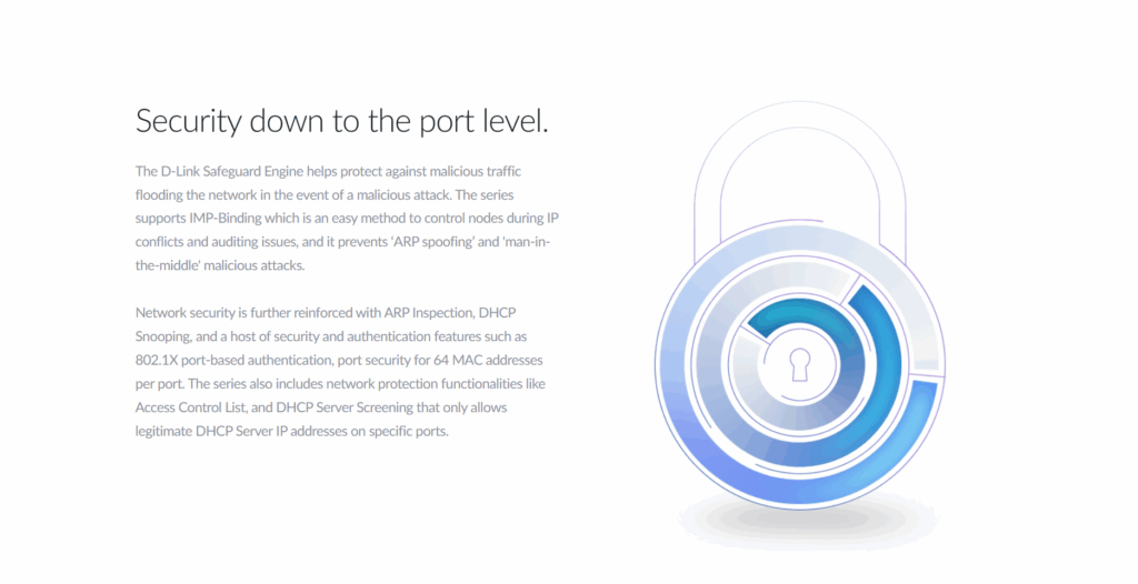 Security FeaturesACL, SSH, Port Security (64 MAC/port), DoS, ARP/DHCP snooping, RADIUS/802.1X, D-Link Safeguard Engine