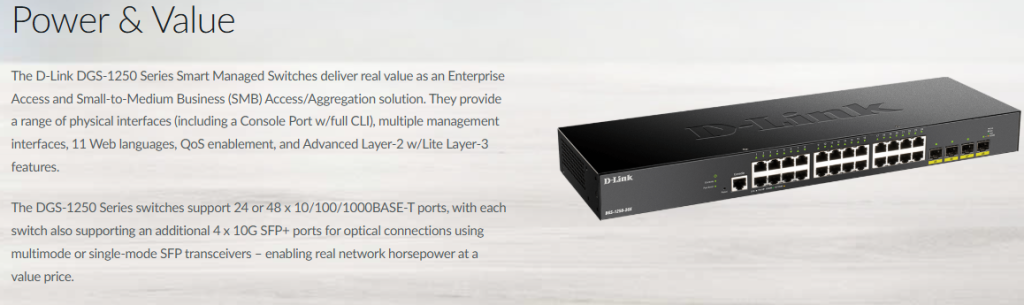 DGS-1250-28X28 Ă— GigabitNo4 10G SFP+N/AHigh-performance enterprise networks