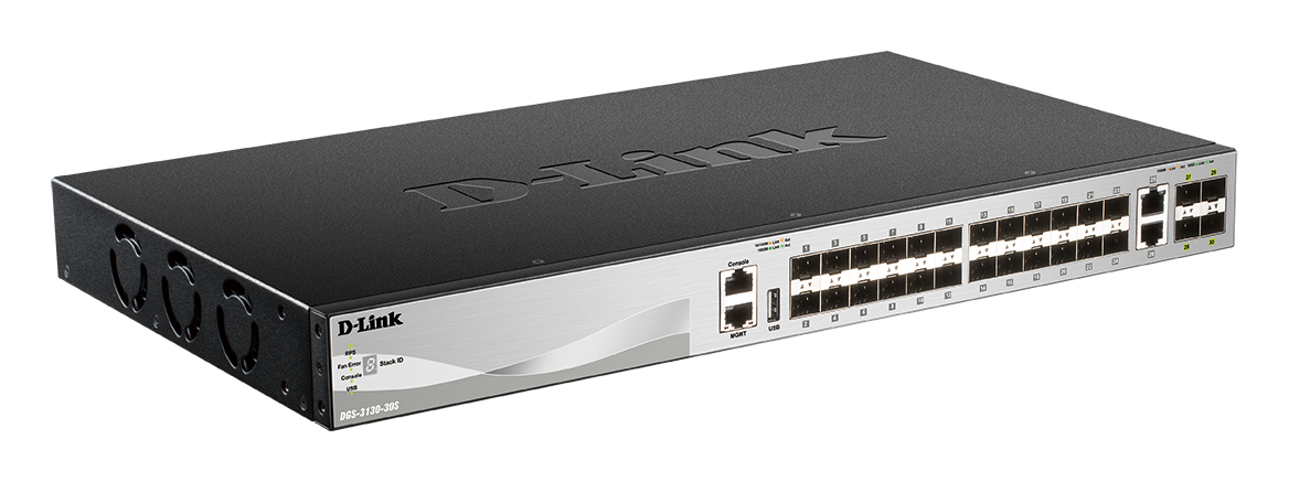 The D-Link DGS-3130-30S is a 30-port Layer 3 stackable managed switch with 24 SFP ports, 4 10G SFP+ uplink ports, and advanced routing and security features, ideal for scalable enterprise networks.