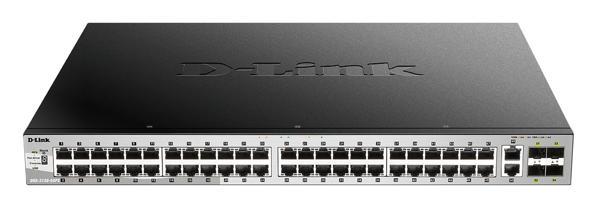 The D-Link DGS-3130-54PS is a 54-port Layer 3 stackable managed switch with 48 PoE+ ports, 4 10G SFP+ uplinks, and advanced routing and security, offering a 370 W PoE budget for enterprise-grade deployments.
