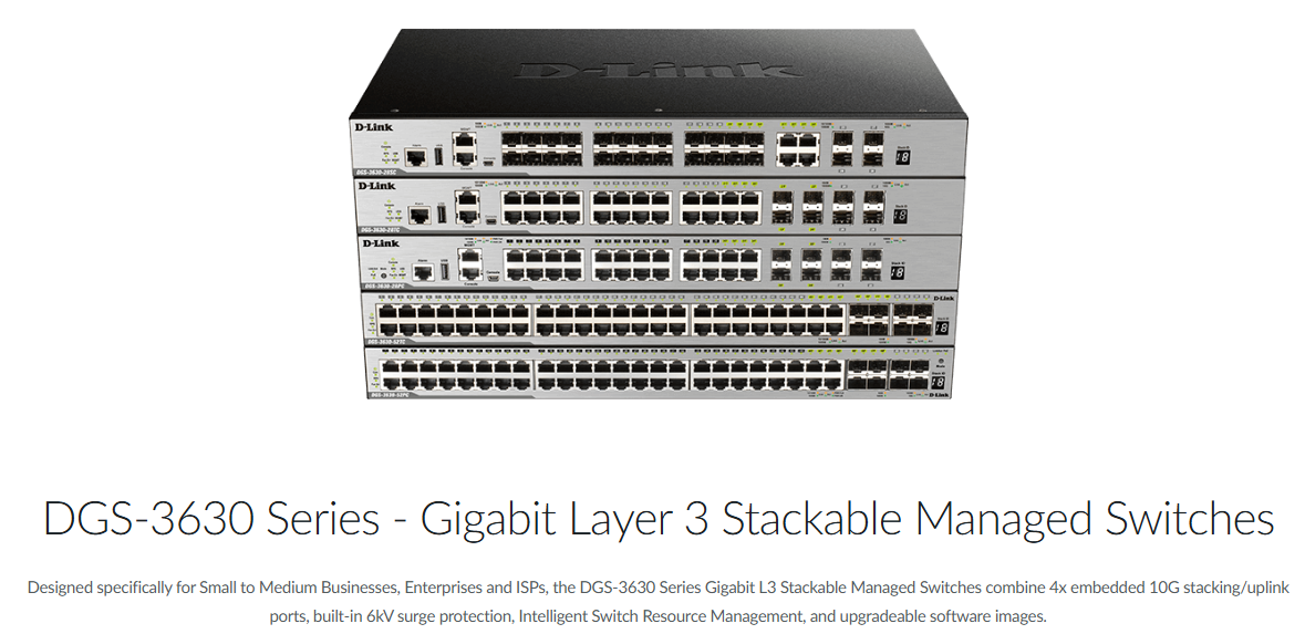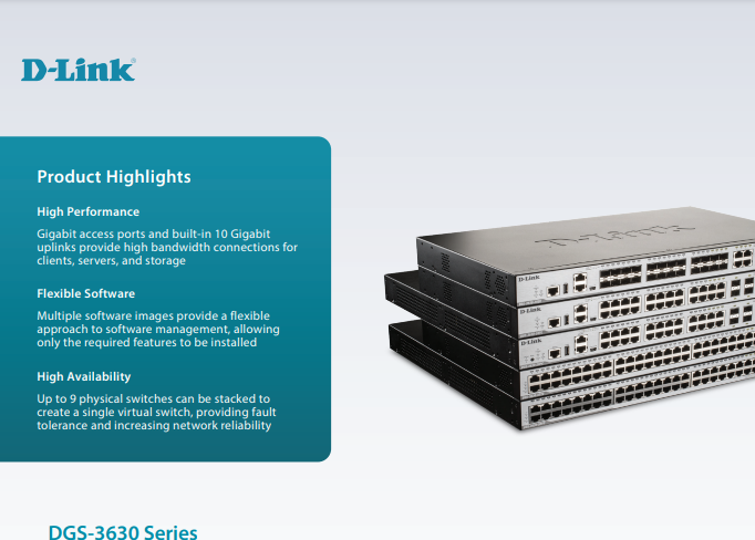 The D-Link DGS-3630-28TC is a high-performance Layer 3 stackable managed Gigabit switch designed to meet the needs of enterprise networks. D-Link DGS-3630-28TC It also features 20 Gigabit Ethernet ports, 4 Gigabit combo ports (RJ-45/SFP), and 4 10G SFP+ uplink ports, offering versatile connectivity options for demanding applications. The switch supports advanced Layer 3 routing protocols such as OSPF, BGP, and VRRP, ensuring efficient and reliable traffic management for large-scale networks.