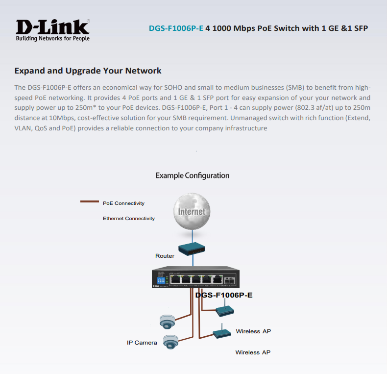 The D-Link DGS-F1006P-E is a compact and powerful PoE+ switch designed for small to medium-sized business networks, offering seamless connectivity and power delivery for essential network devices. D-Link DGS-F1006P-E It also features 4 Gigabit Ethernet PoE+ ports, 1 additional Gigabit Ethernet uplink port, and 1 SFP uplink slot for flexible, high-speed connections. D-Link DGS-F1006P-E comes With an extended PoE transmission range of up to 250 meters, this switch is ideal for long-distance deployments, such as IP surveillance, wireless access points, and VoIP phone networks.