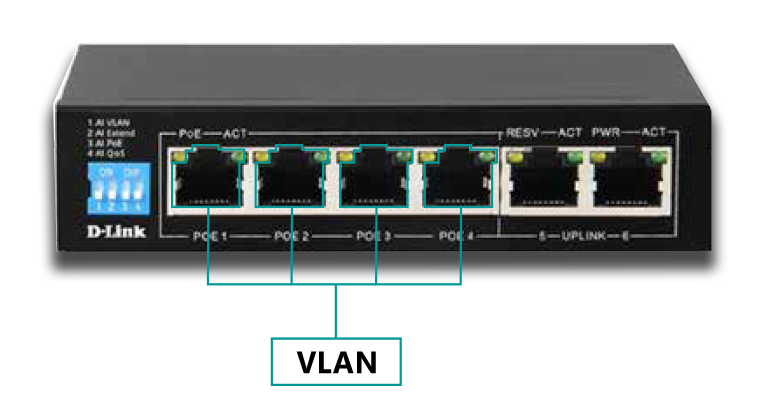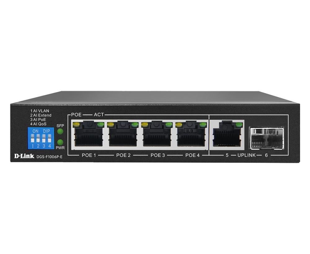 The D-Link DGS-F1006P-E is a 6-port PoE+ switch with 4 PoE+ ports, 1 Gigabit uplink, and 1 SFP slot. It features a 250m PoE range, robust power budget, and silent operation, perfect for IP surveillance and business networks.