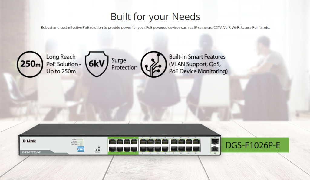 The D-Link DGS-F1026P-E has robust and cost-effective PoE solution to provide power for your PoE powered devices such as IP cameras, CCTV, VoIP, Wi-Fi Access Points, etc.