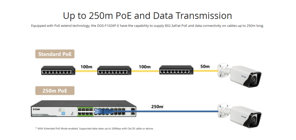 D-Link DGS-F1026P-E is equipped with PoE extend technology, the DGS-F1026P-E have the capability to supply 802.3af/at PoE and data connectivity on cables up to 250m long.