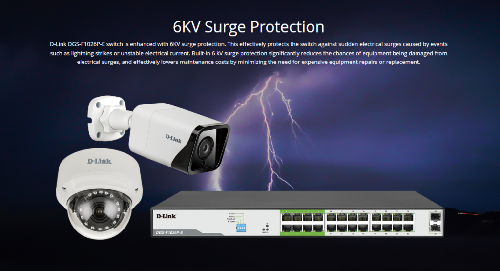 D-Link DGS-F1026P-E switch is enhanced with 6KV surge protection. This effectively protects the switch against sudden electrical surges caused by events such as lightning strikes or unstable electrical current. Built-in 6 kV surge protection significantly reduces the chances of equipment being damaged from electrical surges, and effectively lowers maintenance costs by minimizing the need for expensive equipment repairs or replacement.