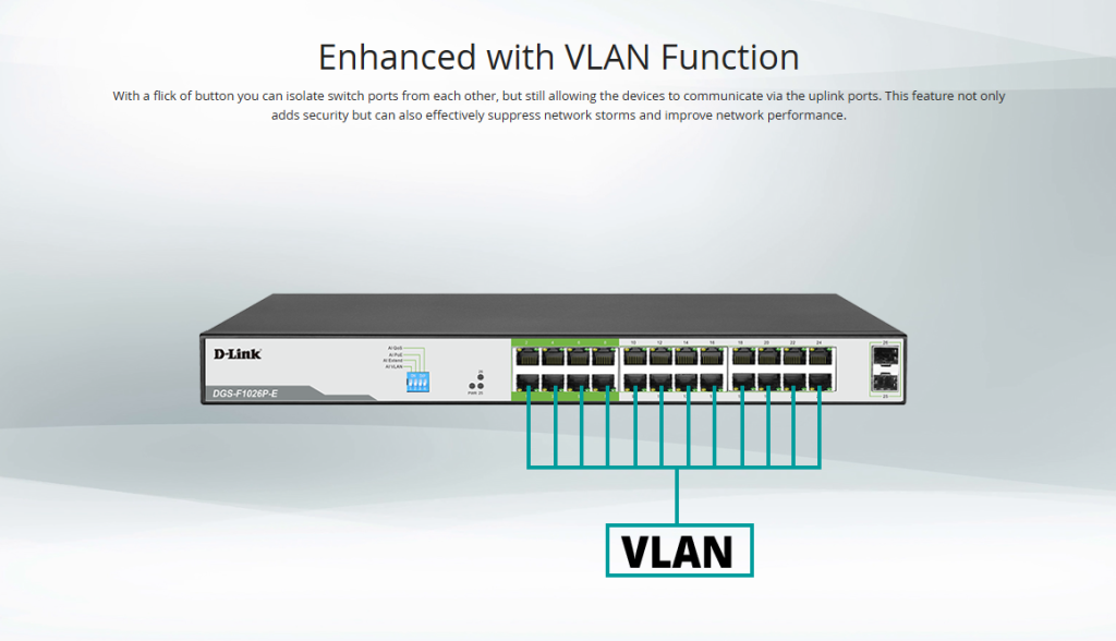 D-Link DGS-F1026P-E comes with a flick of button you can isolate switch ports from each other, but still allowing the devices to communicate via the uplink ports. This feature not only adds security but can also effectively suppress network storms and improve network performance.
