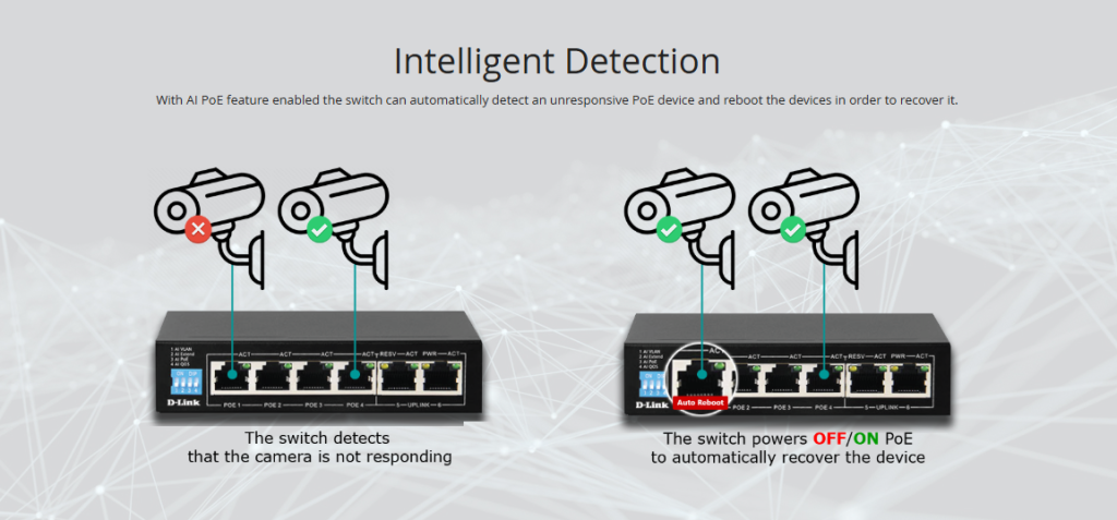 D-Link DGS-F1026P-E comes with AI PoE feature enabled the switch can automatically detect an unresponsive PoE device and reboot the devices in order to recover it.