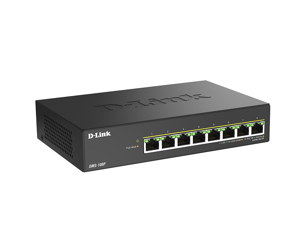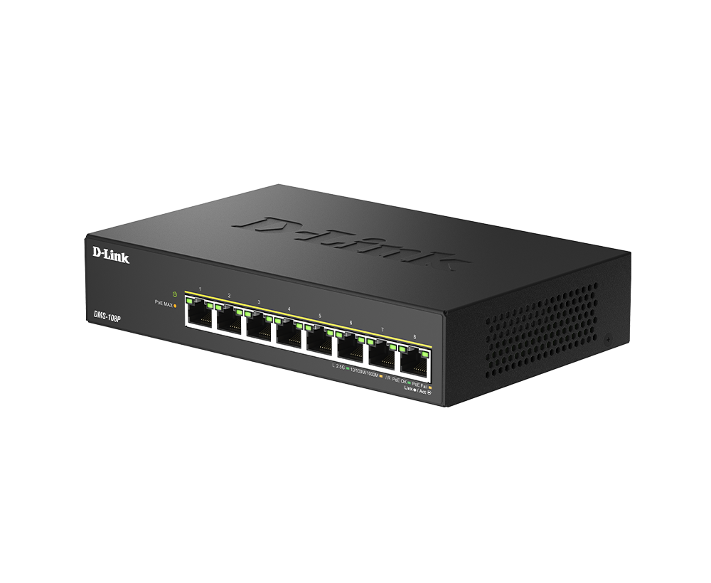 The DMS-108P is an unmanaged 8-port multi-gigabit PoE switch designed to provide high-speed wired connectivity and power delivery for small office and home office networks. It enables the connection of Ethernet, Fast Ethernet, Gigabit, and 2.5 Gigabit devices through auto-negotiating ports without requiring configuration.