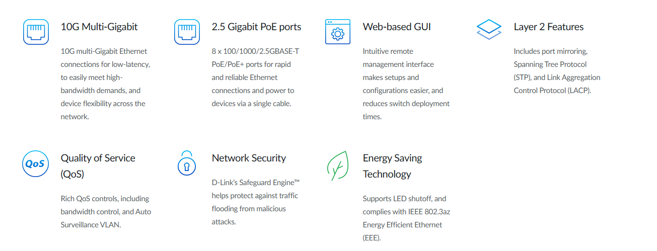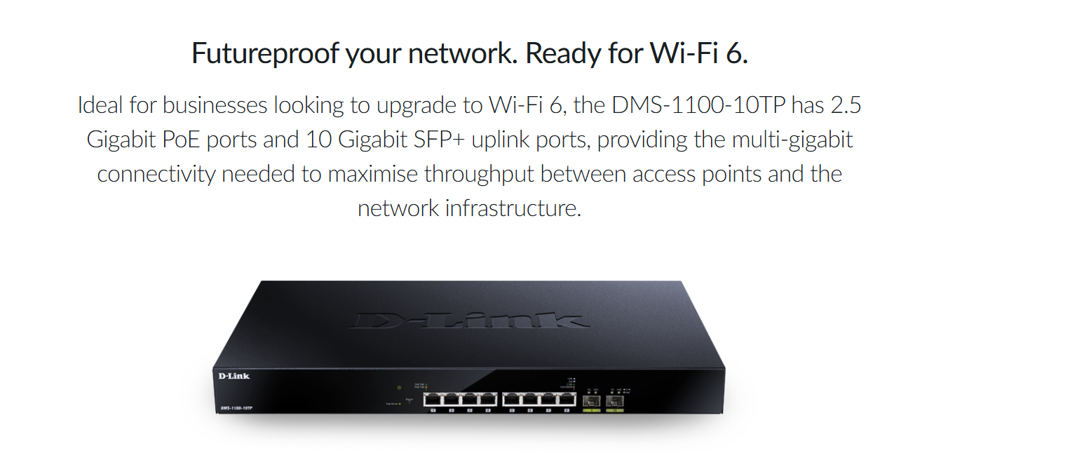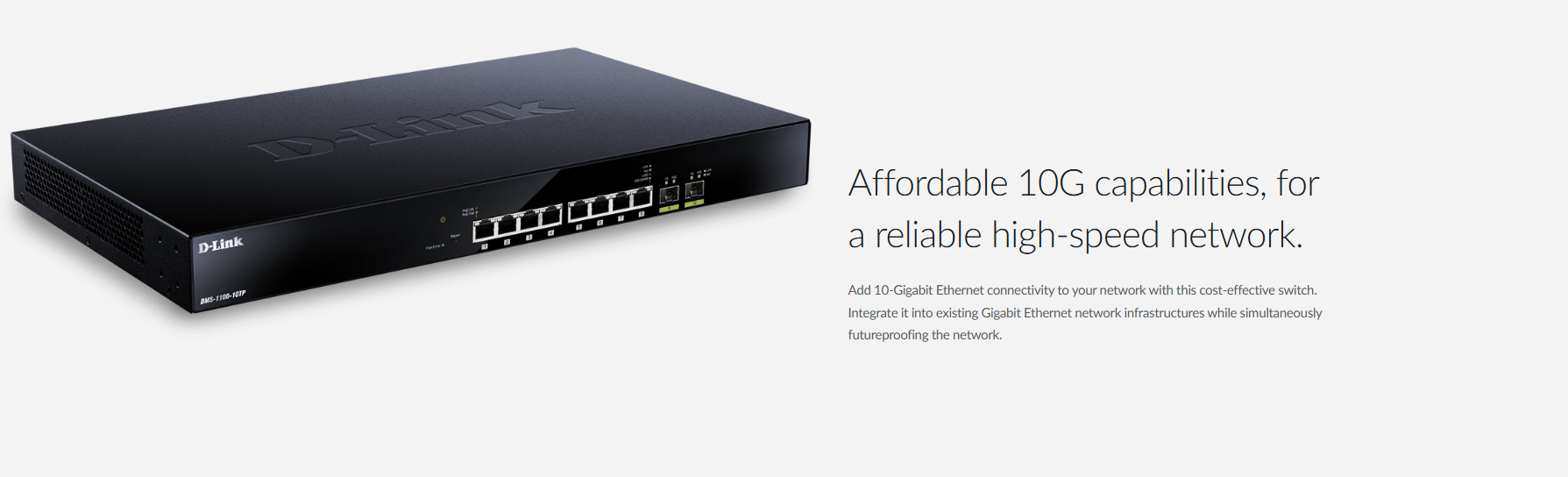 The D-Link DMS-1100-10TP is a high-performance Smart Managed Switch featuring 8× 2.5G PoE/PoE+ ports and 2× 10G SFP+ uplinks. With a 270W PoE budget, advanced Layer 2 features, and intuitive web-based management, it’s the perfect choice for powering Wi-Fi 6 access points, IP cameras, and VoIP phones in modern business networks.g.
