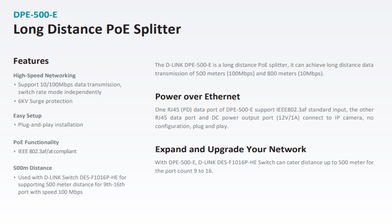 The D-Link DPE-500-E is a long-distance PoE splitter extending power and data up to 500 meters for non-PoE devices like IP cameras and access points. It’s plug-and-play and ideal for remote network setups.