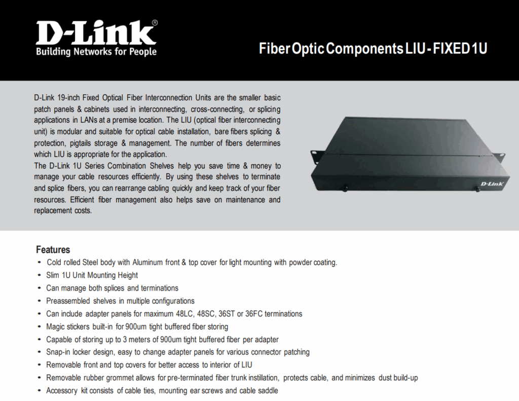 The D-Link NLU-FXXUXXR-06 LIU offers a professional, space-efficient, and cost-effective solution for optical fiber termination, protection, and management, ensuring long-term network stability and simplified maintenance.