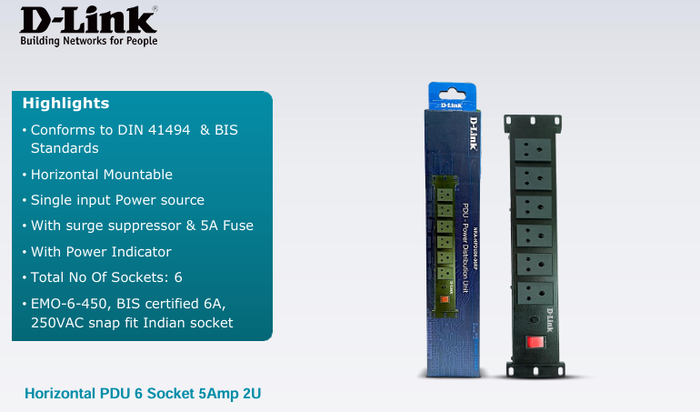 The D-Link NRA-HPDU06-06RP PDU  Power Distribution Unit (PDU) is a reliable and high-performance power management solution for networking and IT environments. Designed for horizontal 2U rack mounting, it offers six 6A round pin sockets, allowing seamless power distribution to multiple devices.