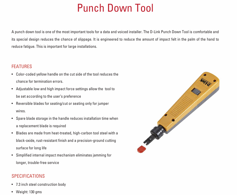 A punch down tool is one of the most important tools for a data and voiced installer. The D-Link Punch Down Tool is comfortable and its special design reduces the chance of slippage. It is engineered to reduce the amount of impact felt in the palm of the hand to reduce fatigue. This is important for large installations.