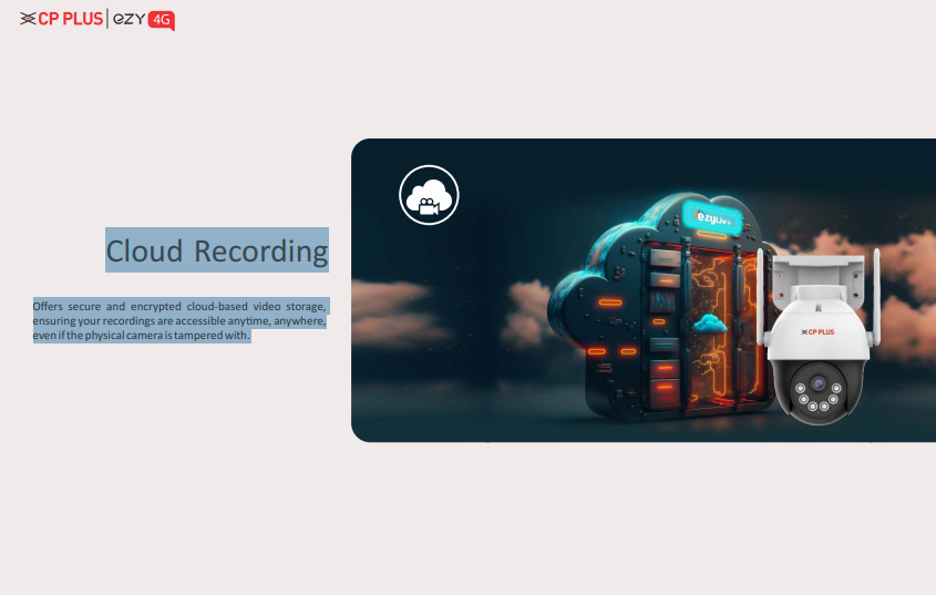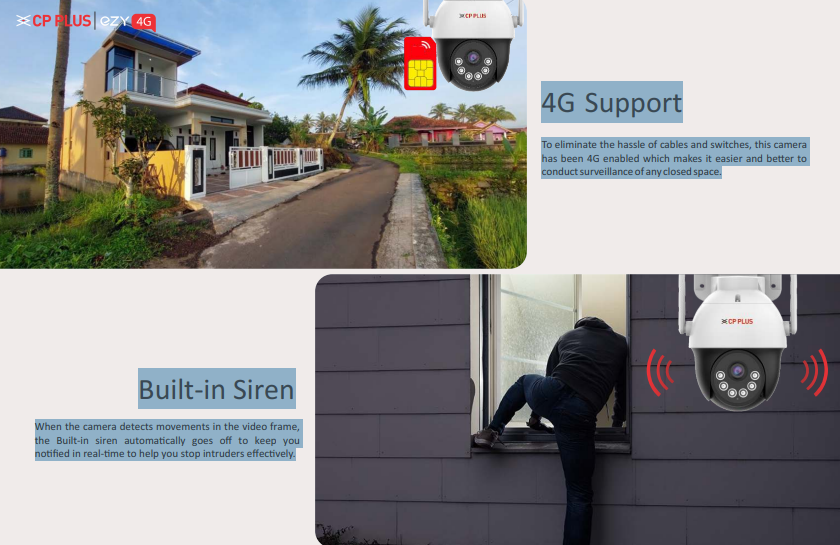 The CP Plus EZ-S35T is a 3MP outdoor 4G LTE security camera designed for surveillance in remote or outdoor locations where Wi-Fi or broadband connectivity is unavailable. This SIM-based CCTV camera connects directly through a 4G LTE network and is designed to operate without Wi-Fi infrastructure. It works independently without requiring an NVR and supports local recording via microSD card up to 256GB, along with optional encrypted cloud storage for remote access.