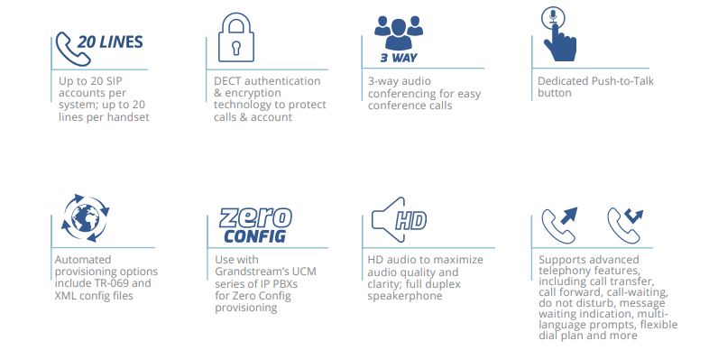 • Supports up to 20 SIP accounts and 20 lines per handset as well as 3-way conferencing