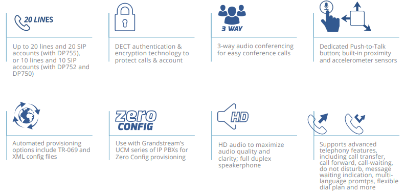 - Up to 20 lines and 20 SIP accounts (with DP755), or 10 lines and 10 SIP accounts (with DP752 and DP750)