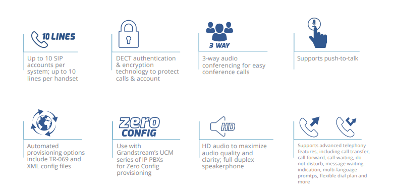 Security is top-tier, with TLS, SRTP encryption, and DECT authentication safeguarding communications and accounts. Provisioning is fast and scalable thanks to TR-069, AES-encrypted XML config files, and Zero Config integration with Grandstream’s UCM series IP PBXs.