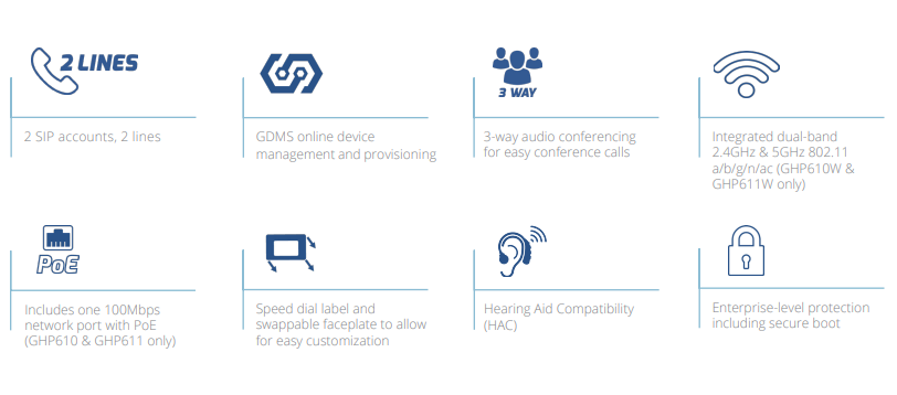 • Includes one 100Mbps network port with PoE (GHP610 & GHP611 only)