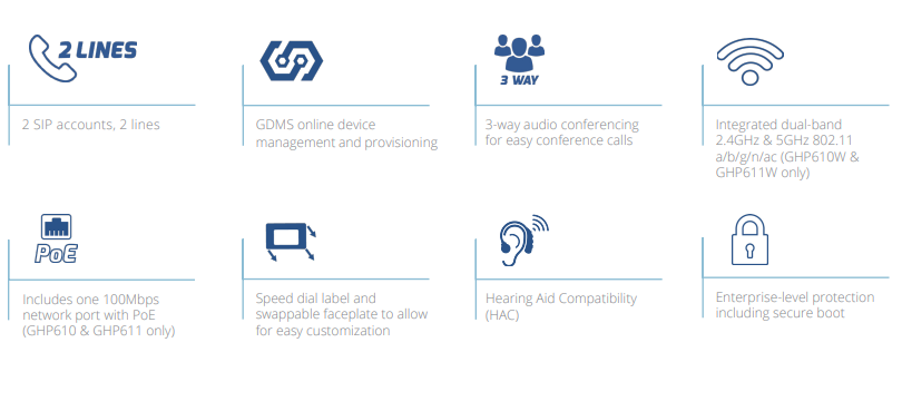 The GHP610(W) & GHP611(W) include an HD speaker on the handset, 2 SIP accounts/lines, 10 speed dial keys and 3 programmable keys and includes 2 models with integrated dual-band Wi-Fi support (GHP610W and GHP611W.)