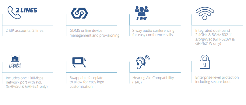 The GHP620(W) & GHP621(W) include an HD speaker on the handset, 2 SIP accounts/lines, 10 speed dial keys and 3 programmable keys and includes 2 models with integrated dual-band Wi-Fi support (GHP620W and GHP621W.)