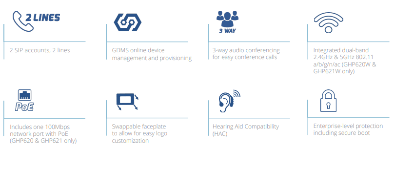 • Includes one 100Mbps network port with PoE (GHP620 & GHP621 only)