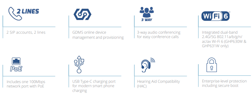 Network Interfaces10/100 Mbps Ethernet with PoE Class 2 Wi-Fi Models (GHP630W/631W): Dual-band 802.11a/b/g/n/ac/ax