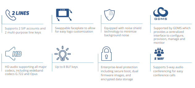 Key Features- 2 SIP accounts - 4 programmable softkeys - 8 dedicated function keys - EHS-compatible headset jack