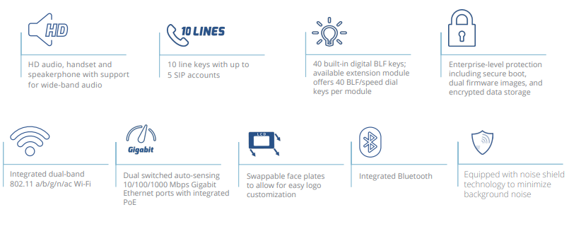 • 40 built-in digital BLF keys; available extension module offers 40 BLF/speed dial keys per module
