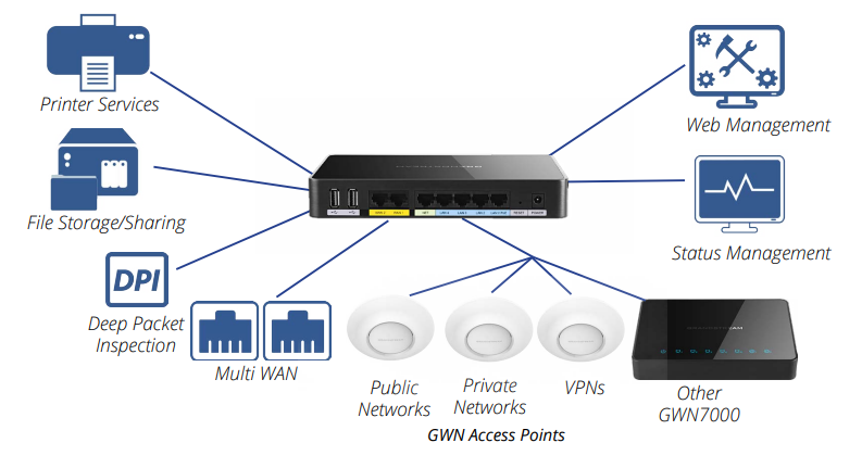 Grandstream GWN7000 is a powerful enterprise-grade multi-WAN Gigabit VPN router. Ideal for the enterprise, small-to-medium business, retail, education, hospitality, and medical markets, the GWN7000 supports comprehensive WiFi and VPN solutions that can be shared across one or many different physical locations. It features high-performance routing and switching power and a hardware-accelerated VPN client/server for secure inter-office connectivity. To maximize network reliability, the GWN7000 supports traffic load balancing and failover. The GWN7000 features an embedded controller and automated provisioning master that can set up and manage up to 300+ in-network GWN series WiFi Access Points. This can be easily operated through the product’s intuitive web browser user interface, which also offers a central panel to monitor and control the entire network.