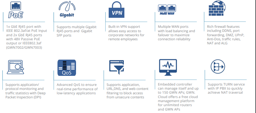 • Embedded controller can manage itself and up to 150 GWN APs; GWN.Cloud offers a free cloud management platform for unlimited routers and GWN APs