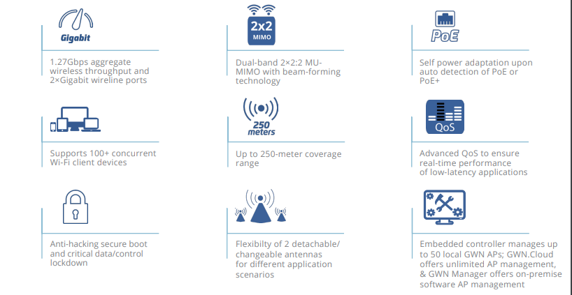 • Embedded controller manages up to 50 local GWN APs; GWN.Cloud offers unlimited AP management, & GWN Manager offers on-premise software AP management