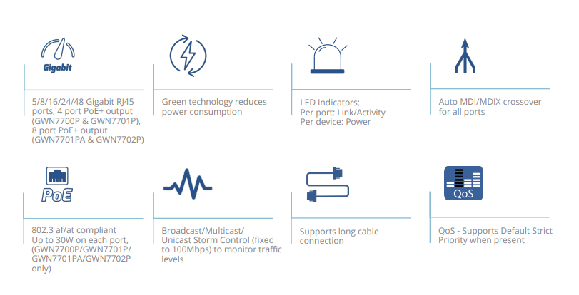 • 5/8/16/24/48 Gigabit RJ45 ports, 4 port PoE+ output (GWN7700P & GWN7701P), 8 port PoE+ output (GWN7701PA & GWN7702P)