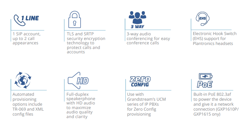 Grandstream GXP1610P is compatible with Grandstream’s UCM series IP PBXs via Zero Config provisioning, the GXP1610P offers 3-way audio conferencing, a full-duplex HD speakerphone, and TLS/SRTP encryption to protect calls and user accounts. It includes a RJ9 headset jack, multilingual support, QoS prioritization, and advanced telephony features like call hold, transfer, forwarding, call waiting, call history, and personalized ringtones.
