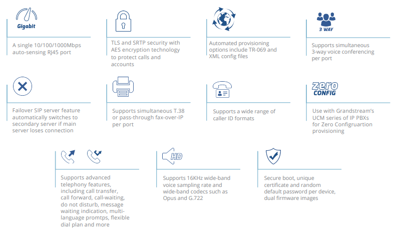 Grandstream GXW4232 v2 comes with features like SRTP, TLS/SIPS, HTTPS, SecureBoot, random default passwords, and unique device certificates. Reliable fax support is ensured with T.38 FoIP and G.711 fallback. The device also supports three-way voice conferencing per port for enhanced telephony functionality.