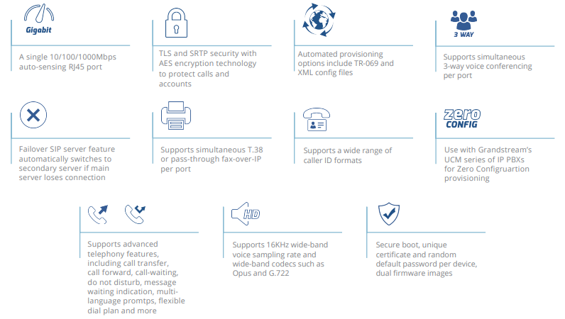 For exceptional audio quality, the Grandstream GXW4248 supports wideband voice codecs like Opus and G.722, alongside standard codecs including G.711, G.723.1, G.726, G.729 A/B, and iLBC. Carrier-grade echo cancellation (G.168), dynamic jitter buffering, and automatic fallback to G.711 ensure crystal-clear communications in any environment. Each port supports 3-way voice conferencing, making the GXW4248 ideal for busy office and contact center environments.