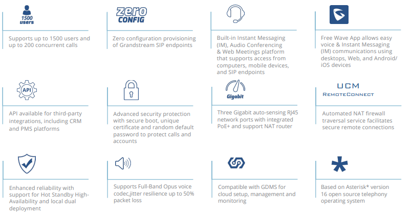 Grandstream UCM6302A IP PBX comes with built-in support for the Wave app for Android, iOS, desktop, and web, users can enjoy easy, on-the-go unified communications. Plus, customizable IVR menus, auto attendants, Hot Standby High Availability, and third-party CRM/PMS API integration make this IP PBX a future-proof investment for growing businesses.