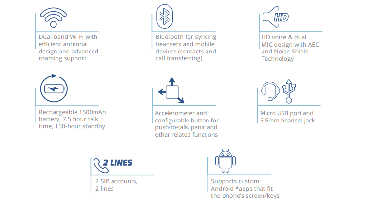 For enhanced mobility, the WP820 integrates Bluetooth 4.2 for pairing with wireless headsets and even syncing with mobile devices for contacts and call transfers. It includes an accelerometer, vibration motor, proximity sensor, and a programmable push-to-talk button for customizable emergency, panic, or paging functions. A Micro USB port and 3.5mm headset jack add further flexibility.