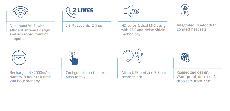 Grandstream WP825 comes with an upgraded 2000mAh rechargeable battery providing up to 8 hours of talk time and 200 hours of standby, this rugged phone keeps teams reliably connected during long, demanding shifts. Its flexible telephony features include 3-way conferencing, LDAP phonebook support, call logs, server redundancy, and auto-answer — all secured by robust protocols like TLS, SRTP, WPA3 Enterprise, and 802.1X.