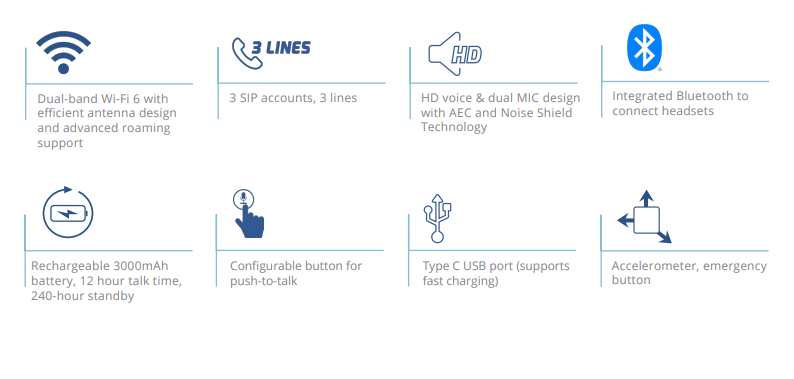 Grandstream WP826 is built to keep pace with fast-moving teams, the Grandstream WP826 delivers up to 12 hours of talk time and 240 hours of standby from its large 3000mAh rechargeable battery, with Type-C fast charging support for minimal downtime. Grandstream WP826 it also supports 3 SIP accounts and 3 concurrent lines, enhanced by HD voice, dual microphones, AEC, and Noise Shield Technology for crystal-clear call quality even in noisy environments.