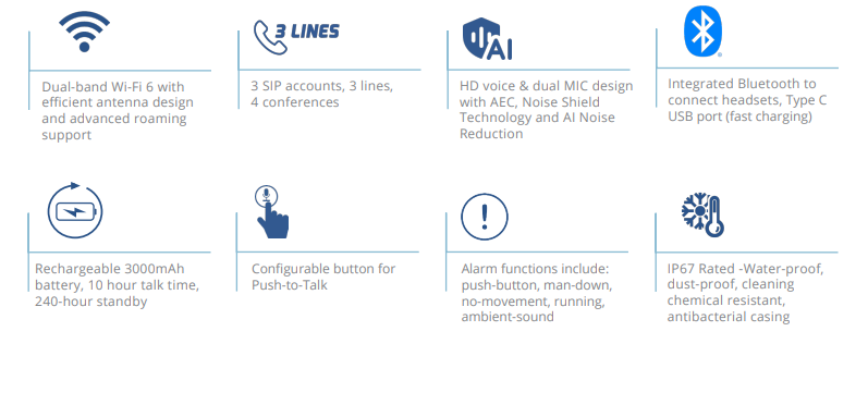 Grandstream WP836 comes with a rugged IP67-rated waterproof, dustproof, and cleaning chemical-resistant antibacterial casing, the WP836 thrives in harsh, high-activity environments. The AI-powered Noise Shield Technology, combined with dual microphones, HD audio, and Hearing Aid Compatibility (HAC) support, guarantees outstanding call clarity even in noisy industrial or medical spaces.