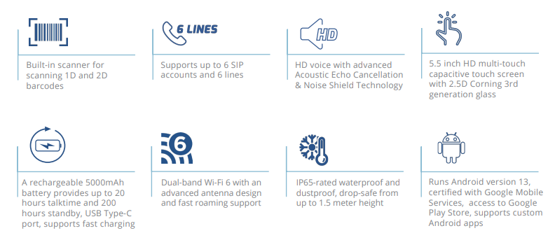 Grandstream WP856 has a designed for mobile workers and field professionals, it features a built-in 1D/2D barcode scanner, making it perfect for inventory management, logistics, and point-of-service applications. Additionally, its 13MP rear camera with LED flash, 5MP front camera, and support for 1080p video conferencing ensure high-quality imaging and collaboration.