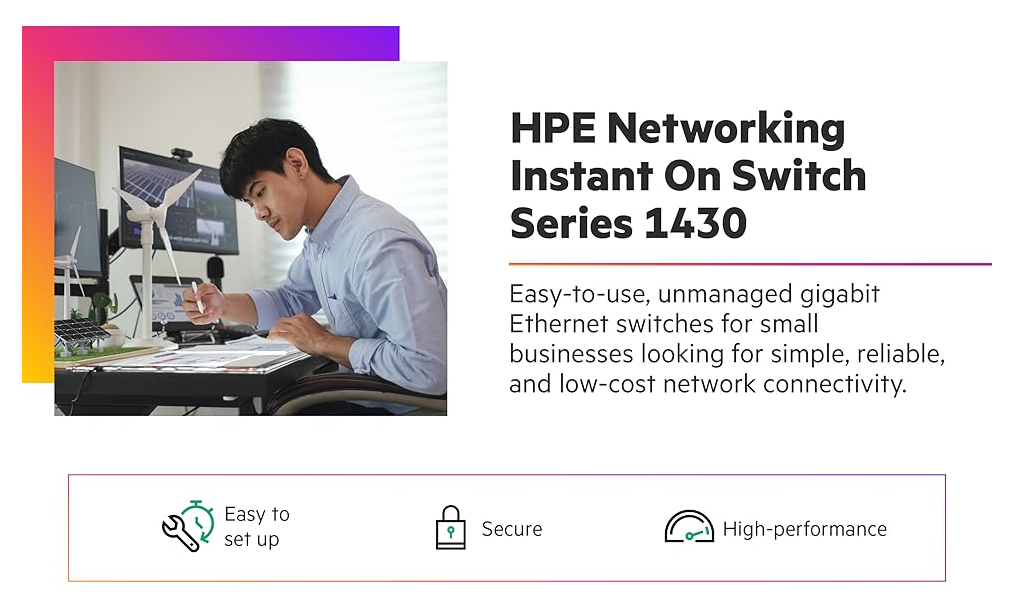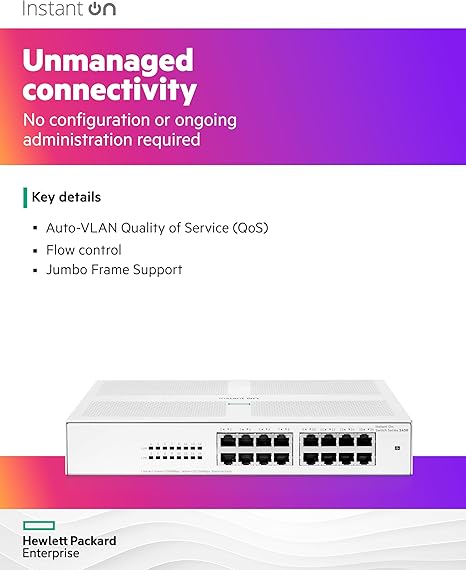 The HPE Aruba ION 1430 16-Port Gigabit Switch is a cost-effective and high-performance networking solution designed for small businesses, retail stores, startups, and remote offices. HPE Aruba ION 1430 16-Port Gigabit Switch comes with 16 auto-sensing Gigabit Ethernet ports, this switch delivers fast and reliable wired connectivity for a variety of devices, including computers, printers, IP phones, and security cameras.