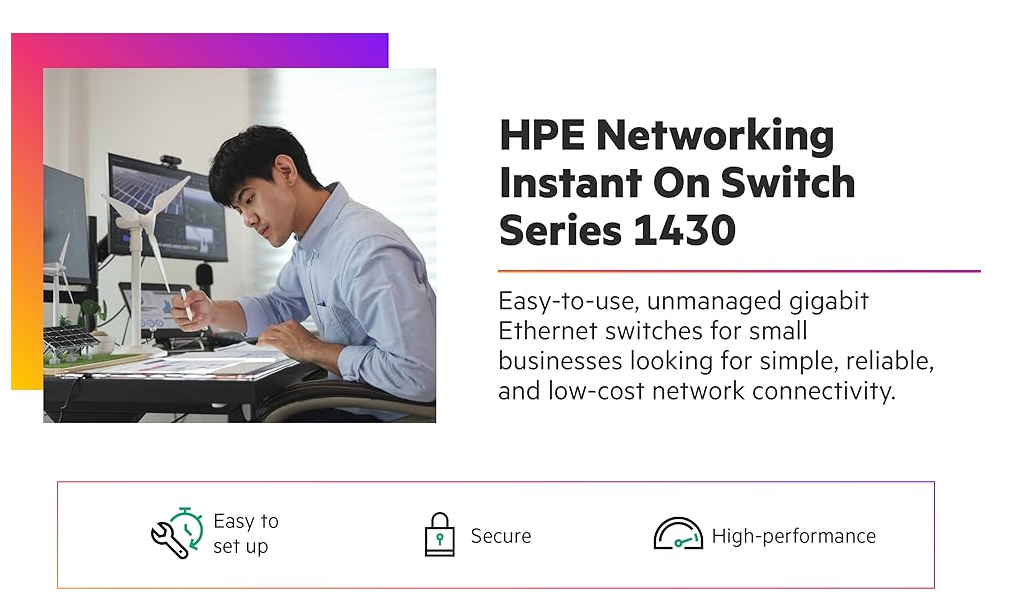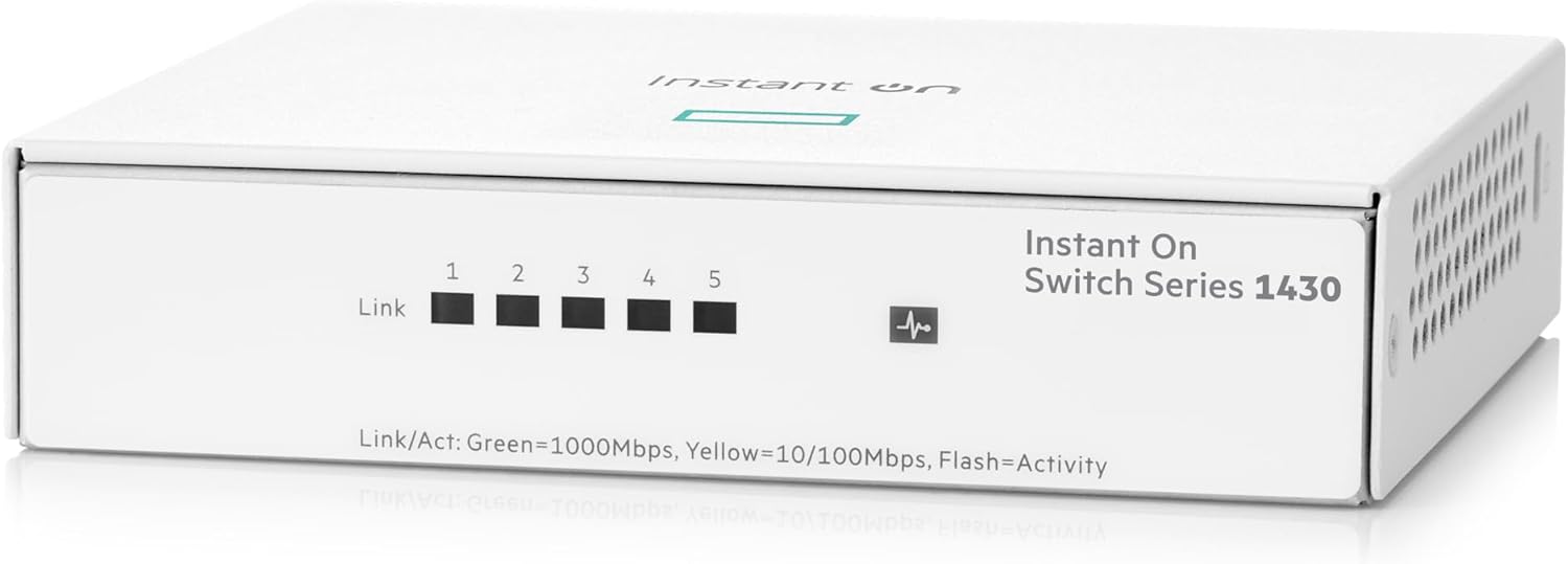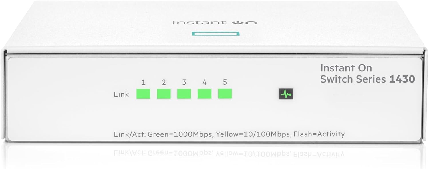 The HPE Aruba ION 1430 5-Port Gigabit Switch is an entry-level, unmanaged networking solution tailored for small businesses, home offices, and startups. HPE Aruba ION 1430 5-Port Gigabit Switch is an plug-and-play device is designed to deliver high-speed connectivity, reliability, and efficiency without the need for complex configurations.