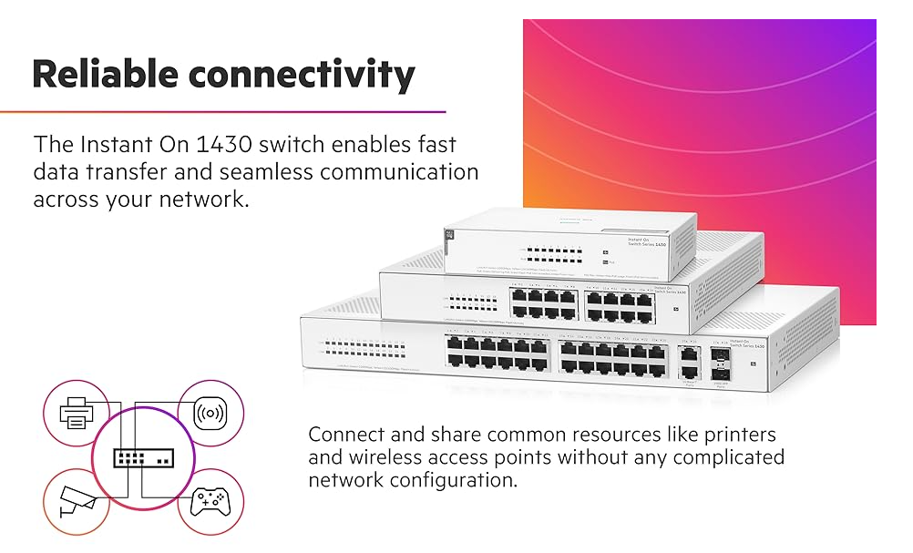 HPE Aruba ION 1430 5-Port Gigabit Switch comes with its 1.0 Mb packet buffer, the HPE Instant On 1430 minimizes latency and optimizes network performance. Auto-negotiation and duplex support provide flexibility in handling both half and full-duplex connections.