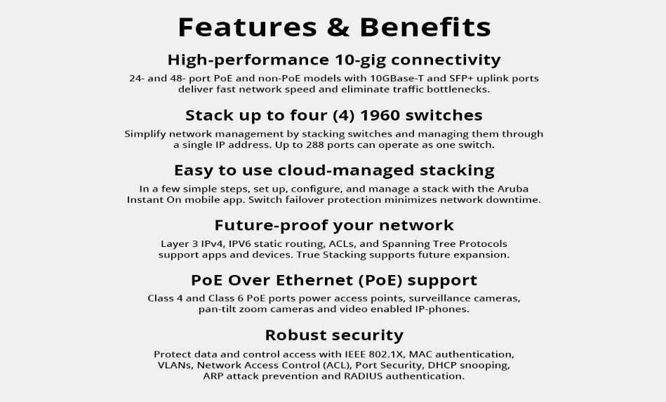 You can manage the switch via the intuitive Instant On Cloud Portal, mobile app, or local web interface, offering flexibility for remote or on-site control. And with stacking support for up to 4 switches, expanding your network is seamless.