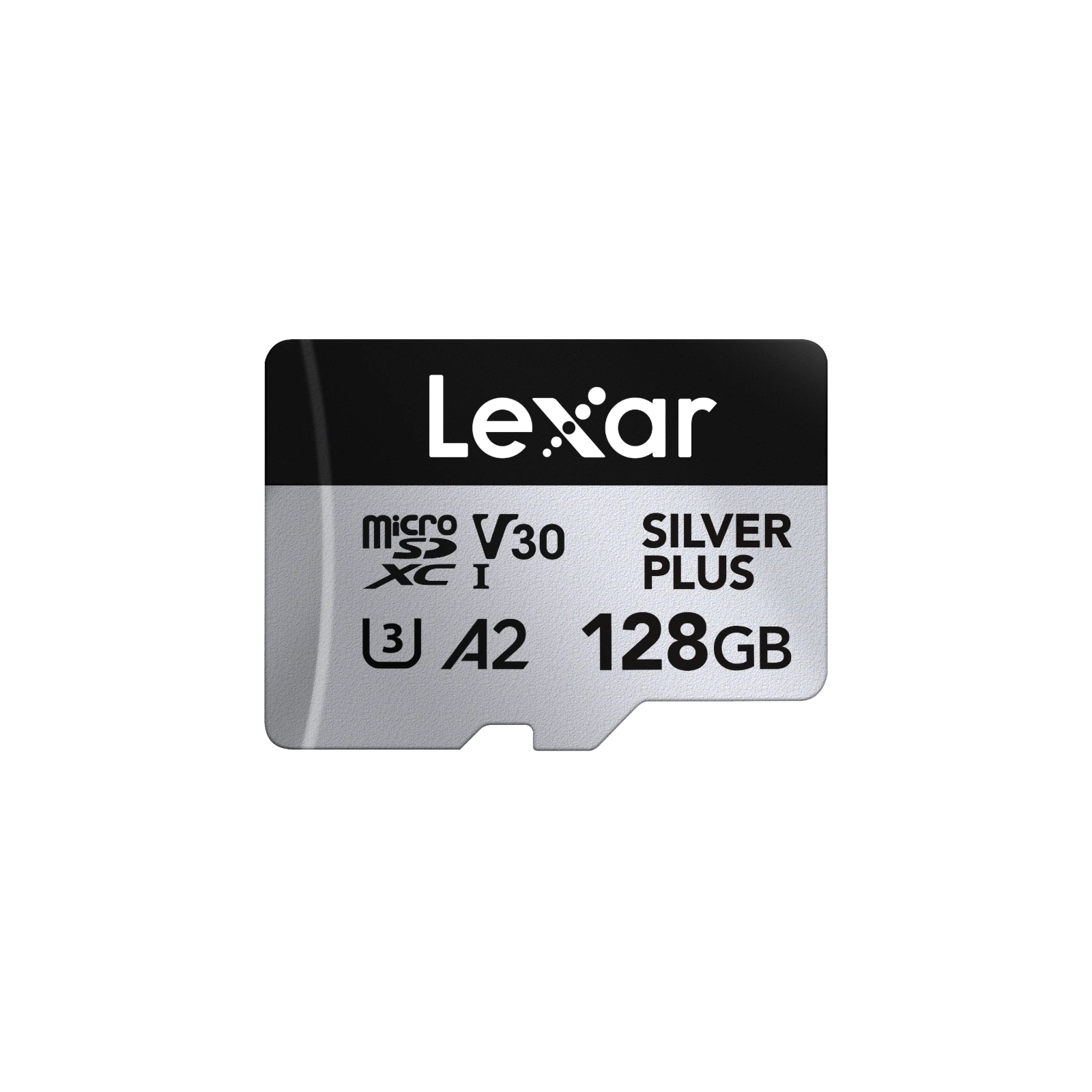 Lexar 128GB SILVER PLUS microSDXC UHS-I Card delivers up to 205MB/s speed, V30, A2 performance for 4K video, apps, and reliable storage in extreme conditions.