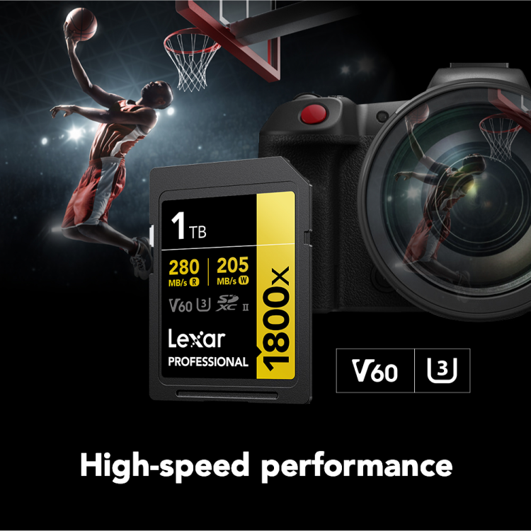 Lexar 1TB Professional 1800x GOLD huge 1TB capacity provides extended recording time for long-format shoots, documentaries, events, wildlife, travel filmmaking, and multi-hour 4K productions — eliminating frequent card swaps. With V60 and U3 ratings, it maintains reliable sustained performance for high-bitrate video.