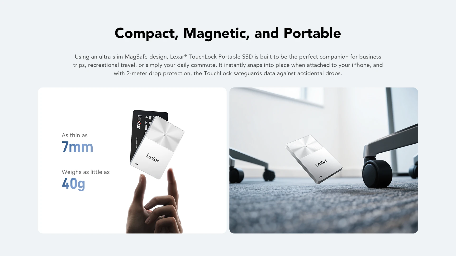 The Lexar TouchLock 2TB Portable SSD is a USB 3.2 Gen 1 external solid-state drive offering up to 450MB/s read and 420MB/s write speeds, with Lexar App–based unlocking support and drop-resistant design.